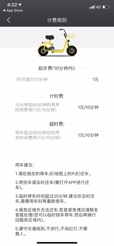 骑行中要注意一点,共享电动单车有临时锁车模式和还车模式,在临时锁车模式下会持续扣费,还车需要在APP内“长按还车”,持续3秒后确认还车,确认支付后结束本次的共享服务。