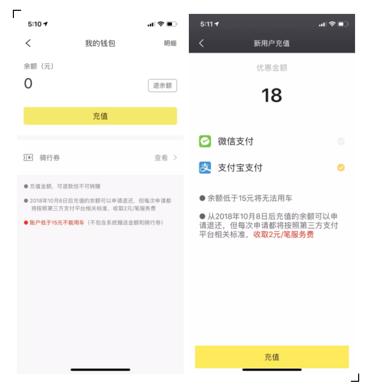 觅马共享电动单车不需要押金,下载APP后首次充值18元就能够使用。充值可通过微信和支付宝进行,计费标准也很亲民,1元/10分钟,同时充值后的金额能随时退款,2-3个工作日内到账,不过退款要收取2元/笔的服务费。需要注意的是余额低于15元不能用车~