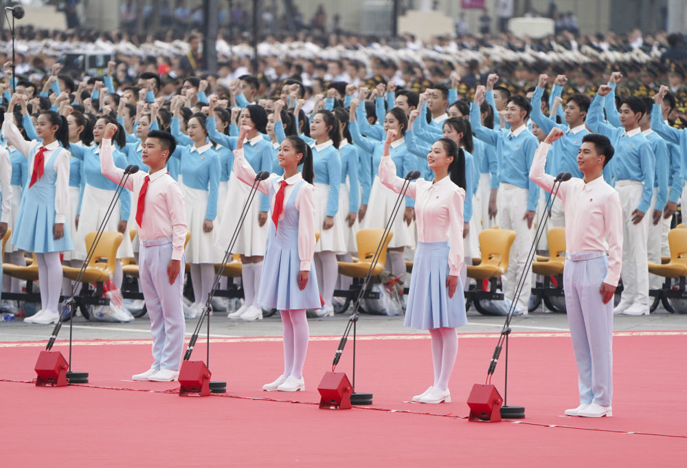 2021年7月1日上午,庆祝中国共产党成立100周年大会在北京天安门广场隆重举行。这是共青团员和少先队员代表集体致献词。新华社记者 陈晔华 摄