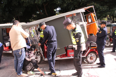 一看到执法人员,正在客运站等待拉客的胡丽琴就推着她的三轮车往外跑。执法人员拦下车子后,胡丽琴大声向他们喊:“我要去接小孩,不要拦我。”“您这是非法改装、非法营运的三轮车,按照相关规定,必须强制拆除非法加装顶棚,对车辆进行查扣。”执法人员对她说。
