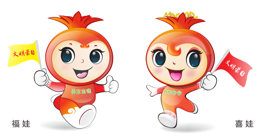 (二)吉祥物采用蒙自市的特产—石榴为原型拟人化变现。男孩取名为“福娃”、女孩取名为喜娃,寓意多籽多福、福至蒙自、平安喜乐的美好愿景。