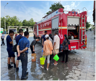 公司在停水之前,已通过州、市媒体以及公司微信公众号平台及时发布紧急通知,同时从蒙自四通泰兴供水有限责任公司协调补充供水量,但随着居民用水量增加,局部区域出现水压不足或间歇停水现象。为保障居民的基本生活用水,公司积极与市消防大队协调,在保证正常战勤的基础上,调出1台消防车以及协调环卫站2台运水车,接水后,每天从早上8:30开始至晚上9:00,分早中晚三个用水高峰时段,送水到小区和校园,供居民和学生使用。
