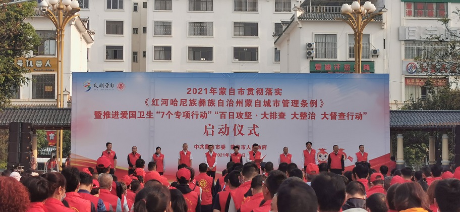 为贯彻落实《红河哈尼族彝族自治州蒙自城市管理条例》,扎实推进爱国卫生“七个专项行动”,2021年3月29日早8:30,市住建局局长张像瑞带领环卫工人40余人参加我市在南湖广场举行的2021年蒙自市贯彻落实《红河哈尼族彝族自治州蒙自城市管理条例》暨推进爱国卫生“七个专项行动”“百日攻坚.大排查 大整治 大督查行动”启动仪式。