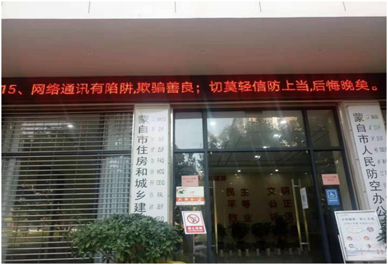 一是局属各单位建立防范宣传责任体系,明确负责领导和联络员,在行政办公区公示栏,会议室、楼道间;人流量较大公园、集市、物业小区、建筑工地等粘贴防骗宣传海报、标语;二是考贝市公安局全套反电信诈骗宣传资料,以QQ群、OA下发机关各科室、局属各单位,要求各科室各单位向内部职工、管辖企业及亲朋好友扩大宣传;三是充分利用LED电子显示屏播放防骗主题游动字幕30余条,定期发布电信网络诈骗预警性提示;四是在我局办公楼、对外办公场所、办证窗口及便民服务中心做好反诈骗宣传资料宣传工作、播放游动字幕20条/日;五是依托本单位的新闻网页及微信公众号、qq群、微信群等公众平台及时推送防骗信息,切实加大对防范电信网络诈骗工作的宣传报道力度,全力落实好此次专项工作领导小组办公室安排的其他防范宣传工作;六是充分发动环卫工人工作特殊性,提醒过往街道市民注意电信诈骗相关事宜;七是积极参加“红河州全民反诈集中宣传行动启动仪式”反诈宣传活动;八是组织住建系统干部职工安装反诈APP。
