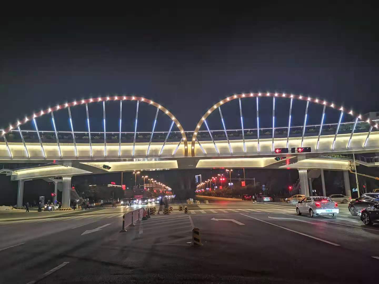 人行天桥的建成能满足步行慢行需求,并兼顾景观、休憩功能。夜景照明结合桥的形式,融合文化、艺术等进行设计,同时满足夜间照明亮度等相关规范要求。凤凰路、学海路人行天桥项目的建设能有效改善人居环境及交通环境,缓解凤凰路、学海路交通压力,减少交通安全隐患,是一项重要的民生工程。红河大道与凤凰路交叉口人行天桥主桥平面呈“口”形布置。上部结构采用18.75+44.5+24.75m连续钢构桥,桥面全宽4m,净宽3.5m,梯道宽3m,单幅主桥长91m,主桥面积约970㎡;天桥人行梯道宽3m,梯道面积约550㎡。