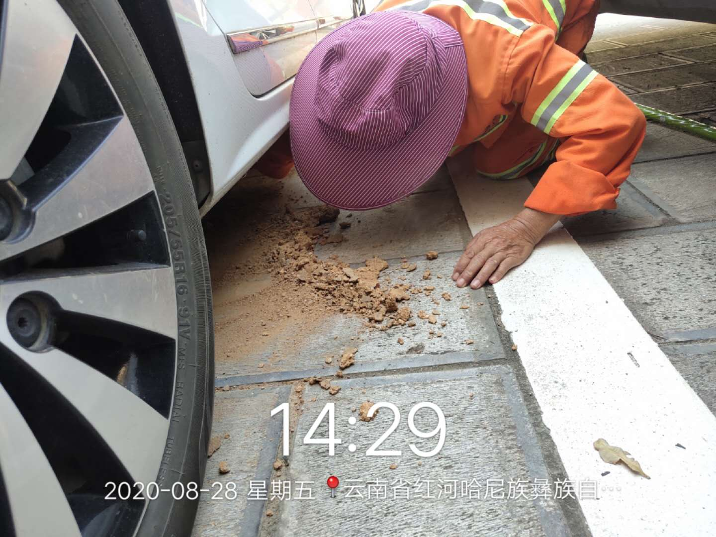 在创建文明城市开展的工作中,我局市政管理中心一线环卫工人,为创文工作顺利达标,不辞辛劳,不怕脏,不怕苦,说干就干的精神值得我们尊敬。2020年8月28日,在朝阳路君悦天下旁,环卫工人正在清扫路面,由于路面上有较多的红泥土,需要用清洗车冲洗才可以洗干净,刚好红泥土被一辆车给挡住了,我们可爱的环卫工作爬在地上,一点一点用手把红泥土扫出来。她爬在地上的情景,是每一位工作在一线的千千万万的环卫工人的缩影,他们在为创文明城市默默无闻地奋斗着!每当你走在大街上想要随手乱扔纸屑的时候、当你开着汽车想从车窗里抛出垃圾的时候,请你一定不要忘了这张跪在地上扫地的图片。