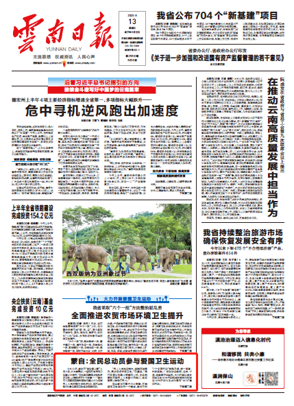 7月26日,省政府办公厅印发了《云南省推进爱国卫生“7个专项行动”方案》,统筹部署全省集中开展为期一年半的“清垃圾、扫厕所、勤洗手、净餐馆、常消毒、管集市、众参与”爱国卫生“7个专项行动”,引导全社会形成健康文明新风尚,全面推进全省卫生城镇创建达标,着力健全完善常态化疫情防控体制机制,推动从环境卫生治理向全面社会健康管理转变,解决好关系人民健康的全局性、长期性问题。8月12日,在云南日报报业集团“文明城市创建看蒙自”全媒体采访组的采访下,8月13日《云南日报》头版报道了《蒙自:全民总动员参与爱国卫生运动》,现将原文摘录。
