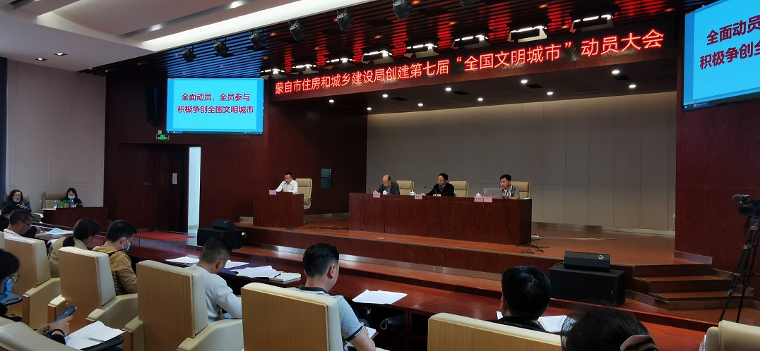 3月9日上午,蒙自市住建局召开蒙自市创建第七届全国文明城市动员大会,全体班子成员,机关各科室、局属各单位干部职工,侨银公司、供水企业、天燃气企业、质量检测中心共100余人参会。