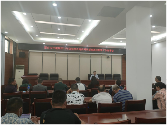按照蒙自市反诈工作领导小组办公室《关于召开全市防范电信诈骗工作联席会的通知》会议要求,及时召开蒙自市住建局2021年防范打击电信网络新型违法犯罪工作部署会传达会议精神。成立由局党组书记、局长任双组长,局班子成员任副组长、机关各科室、局属各单位负责人为成员的工作领导小组。制定下发《蒙自市住建局防范打击电信网络新型违法犯罪工作实施方案》(蒙住建发[2021]70号),坚持以“以防为主、打防并举、综合治理、标本兼治”的工作方针,大力开展反诈骗宣传教育,不断增强广大干部职工识骗防骗意识和能力,最大限度预防和减少电信网络诈骗案件发生。