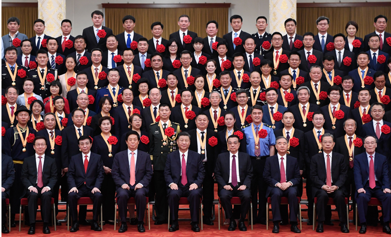 中共中央政治局常委李克强、栗战书、汪洋、赵乐际、韩正,国家副主席王岐山出席颁授仪式。中共中央政治局常委王沪宁主持。