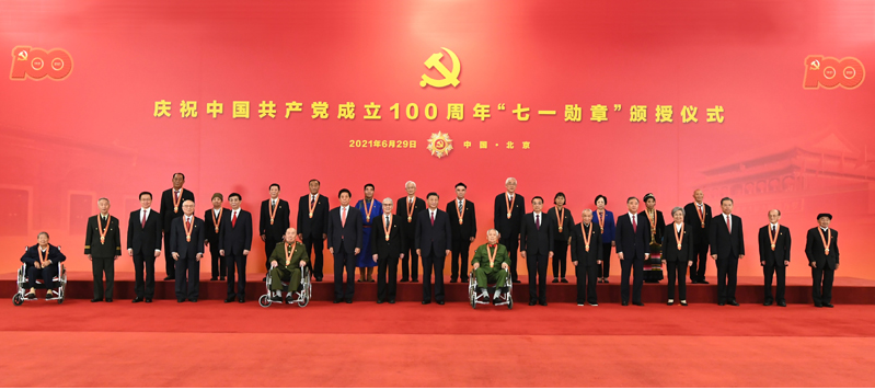 颁授仪式后,习近平等领导同志同“七一勋章”获得者合影留念。