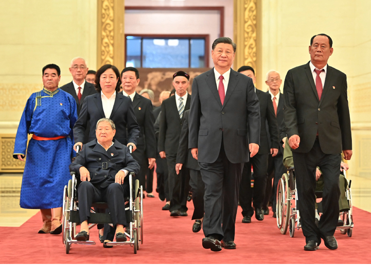 9时58分,伴着欢快的乐曲,习近平同“七一勋章”获得者一同步入会场,全场起立,热烈鼓掌。