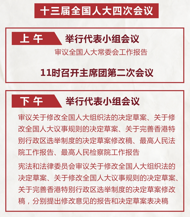 十三届全国人大四次会议9日上午举行代表小组会议,审议全国人大常委会工作报告;11时召开主席团第二次会议。下午举行代表小组会议,审议关于修改全国人大组织法的决定草案、关于修改全国人大议事规则的决定草案、关于完善香港特别行政区选举制度的决定草案修改稿、最高人民法院工作报告、最高人民检察院工作报告;宪法和法律委员会审议关于修改全国人大组织法的决定草案、关于修改全国人大议事规则的决定草案、关于完善香港特别行政区选举制度的决定草案修改稿,分别提出修改意见的报告和决定草案表决稿。