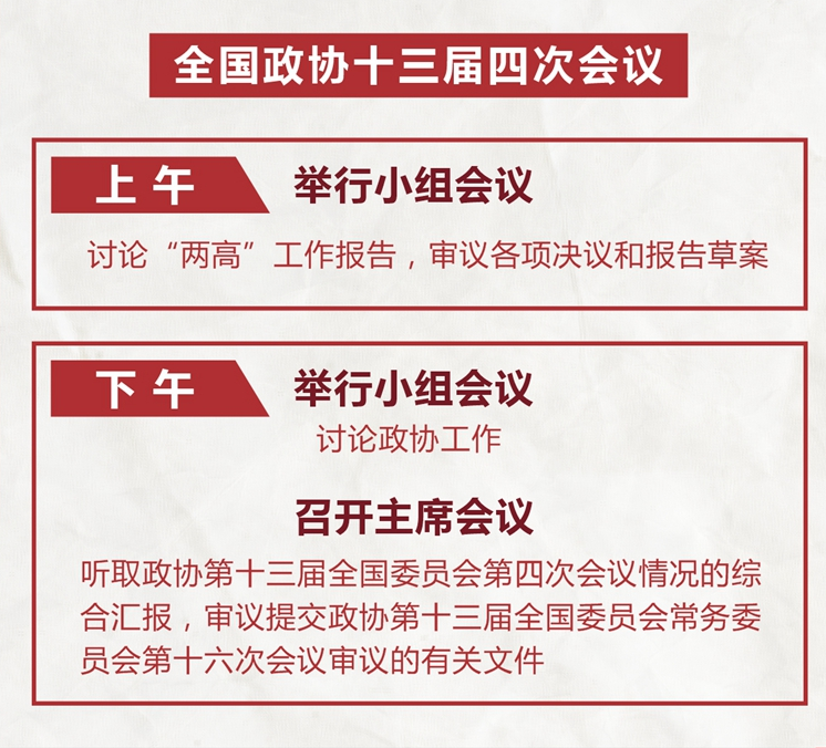 全国政协十三届四次会议9日上午举行小组会议,讨论“两高”工作报告,审议各项决议和报告草案。下午举行小组会议,讨论政协工作;召开主席会议,听取政协第十三届全国委员会第四次会议情况的综合汇报,审议提交政协第十三届全国委员会常务委员会第十六次会议审议的有关文件。