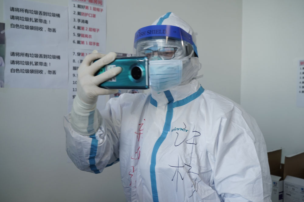 2月18日,新华社记者许杨在武汉同济医院中法院区重症隔离病区采访。新华社发