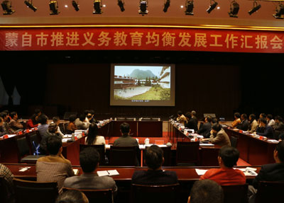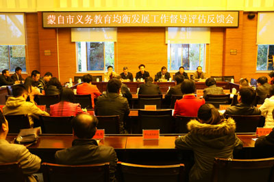 近日,以省政府督学、省教育厅副巡视员卯怀方为组长的省政府义务教育基本均衡发展工作督导评估组到我市开展义务教育均衡发展督导评估工作,经过历时两天的认真督导评估,蒙自以96分的高分顺利通过云南省义务教育均衡发展省级督导评估,达到了国家规定的要求。