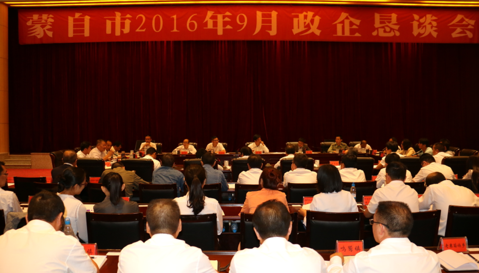 9月20日,州委常委、州委秘书长、市委书记庞俊主持召开蒙自市2016年9月政企恳谈会,邀请我市部分企业代表与市领导、各有关部门负责人就进一步贯彻落实州第八次党代会精神,按照会议提出的今后五年“13611”的工作思路,蒙自市如何精准招商、高效落地,如何服务企业、壮大产业进行探讨交流,以此进一步凝聚发展共识,更好服务企业发展,同心推进蒙自经济跨越式发展步伐。