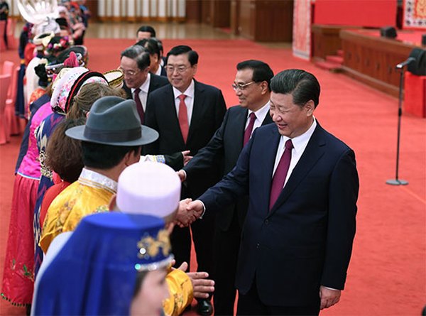 2017年3月11日晚,中共中央统战部、全国人大民族委员会、国家民族事务委员会、全国政协民族和宗教委员会在北京人民大会堂举行茶话会,党和国家领导人习近平、李克强、张德江、俞正声、刘云山、王岐山、张高丽等与出席十二届全国人大五次会议和全国政协十二届五次会议的少数民族代表委员们欢聚一堂,共庆全国两会胜利召开,共祝伟大祖国繁荣昌盛,共话中华民族美好未来。新华社记者 李学仁摄