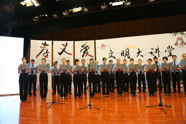 此次文明大讲堂共有七个环节,分别是“唱一首歌、诵一段经典、讲一个故事、看一部短片、作一番分享、做一番讲述、送一份吉祥”。