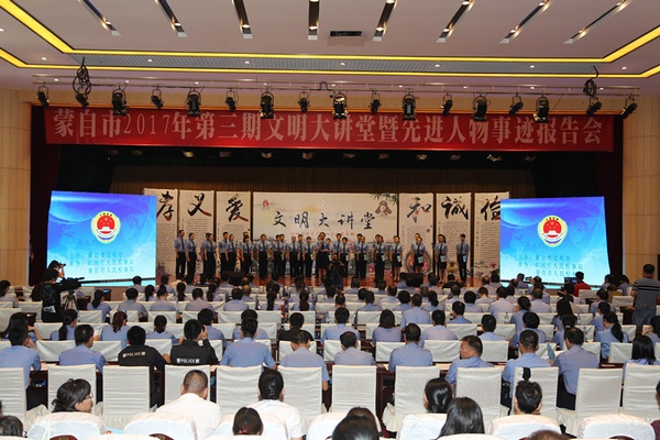 文明花开香四溢,崇德向善树新风。在蒙自市创建全国文明城市如火如荼,全州各族群众喜迎党的十九大、建州60周年之际,由蒙自市委宣传部、市文明办主办,红河州人民检察院、蒙自市人民检察院承办的蒙自市第三期文明大讲堂暨先进人物事迹报告会,于8月18日在蒙自会堂隆重举行。