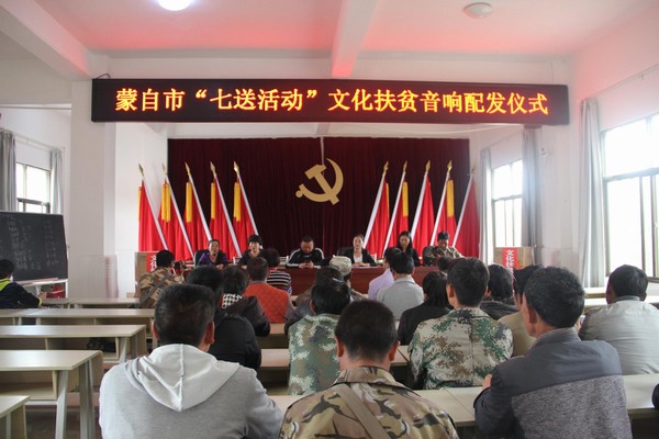 10月11日,蒙自市在冷泉镇小新村委会举行了"七送活动"文化扶贫音响配发仪式,为小新村委会16个组和所本底村委会的17个组配发了33套音响设备。蒙自市文体局副局长冯梅在配发仪式上讲话,希望这33台音响能给各位村民的文化生活带来希望,助力精神脱贫。