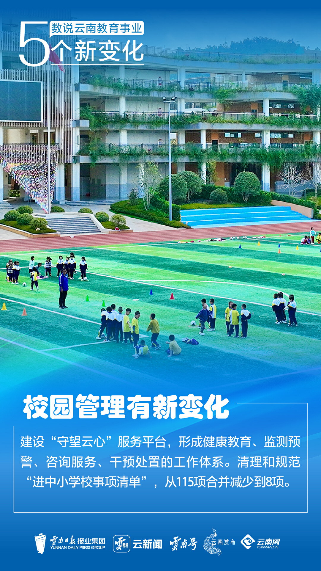 深入推进校园安全防范能力提升三年行动。实施学生心理健康专项行动,建设“守望云心”服务平台,形成健康教育、监测预警、咨询服务、干预处置的工作体系。着力为教育减负,清理和规范“进中小学校事项清单”,从115项合并减少到8项,让广大教师潜心教书育人。