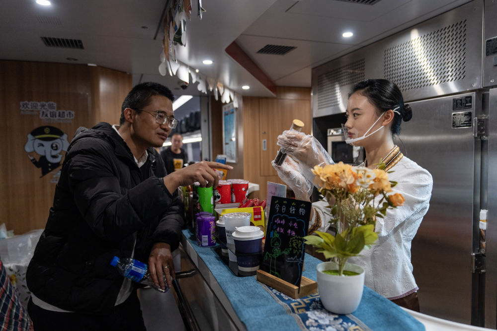 12月2日,一名乘务员在中老铁路C385次列车上向一名旅客介绍咖啡。新华社记者 陈欣波 摄
