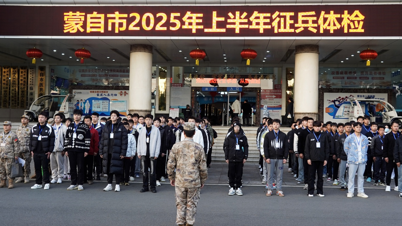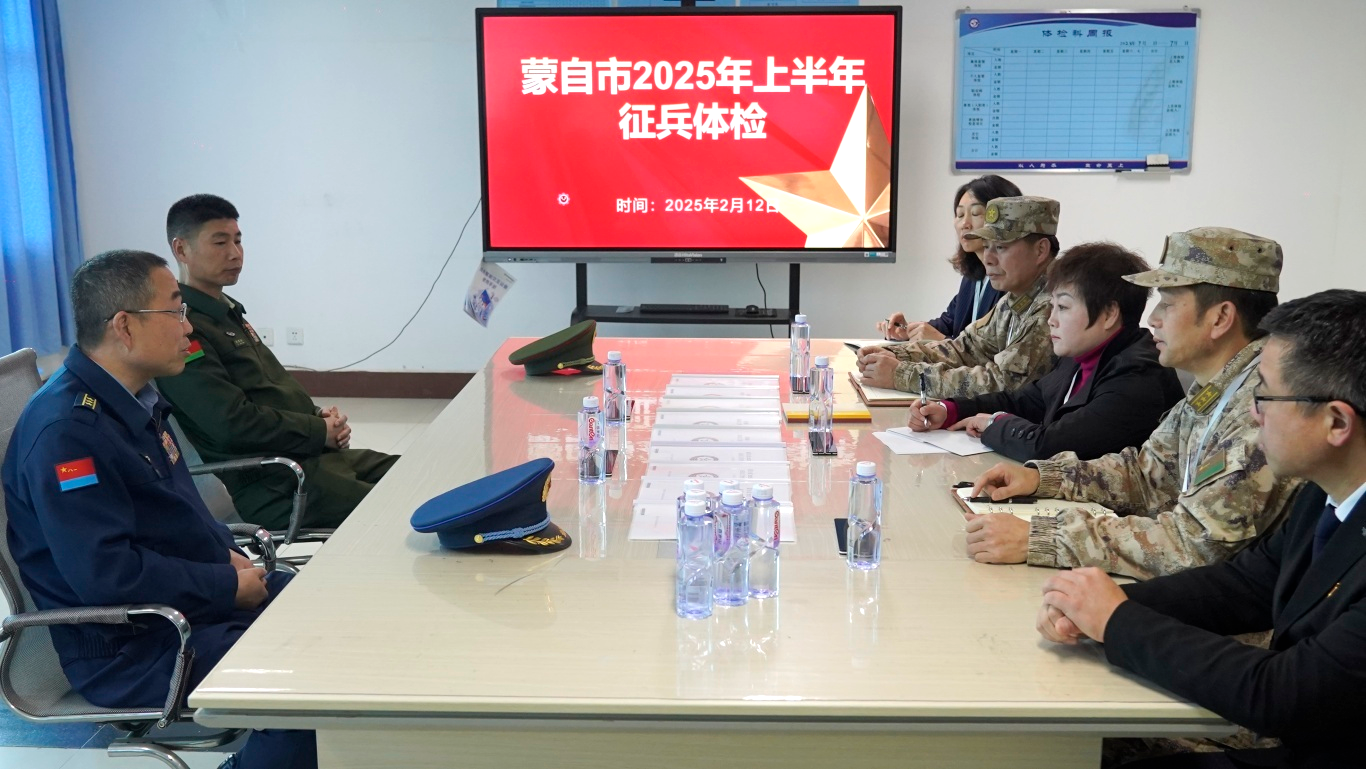 为扎实推进蒙自市2025年上半年征兵工作,严把兵员质量关,从2月12日开始,蒙自市组织初审初检合格预征对象上站体检。红河州征兵领导小组常务副组长、蒙自军分区司令员余明权,红河州征兵办公室副主任、蒙自军分区动员处处长原建利到场检查指导,市委常委、市人武部政委殷炳汉,市人武部部长邓伟雄,副市长张清陪同。