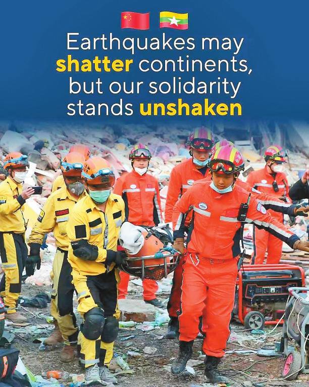 4月1日早晨,缅甸《北极星》周刊总编辑吴温丁向云南国传中心澜湄国传缅语编辑部发送了一张令人动容的海报。海报上,中国和缅甸的国旗置顶并排,格外醒目;国旗下,配文简短有力、饱含深情:“地震让大地撼动,但我们的团结不可撼动”。海报的画面,是中国救援队与缅甸救援队合力运送伤员的现场图片。