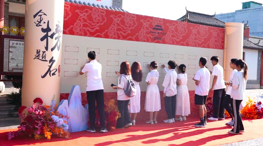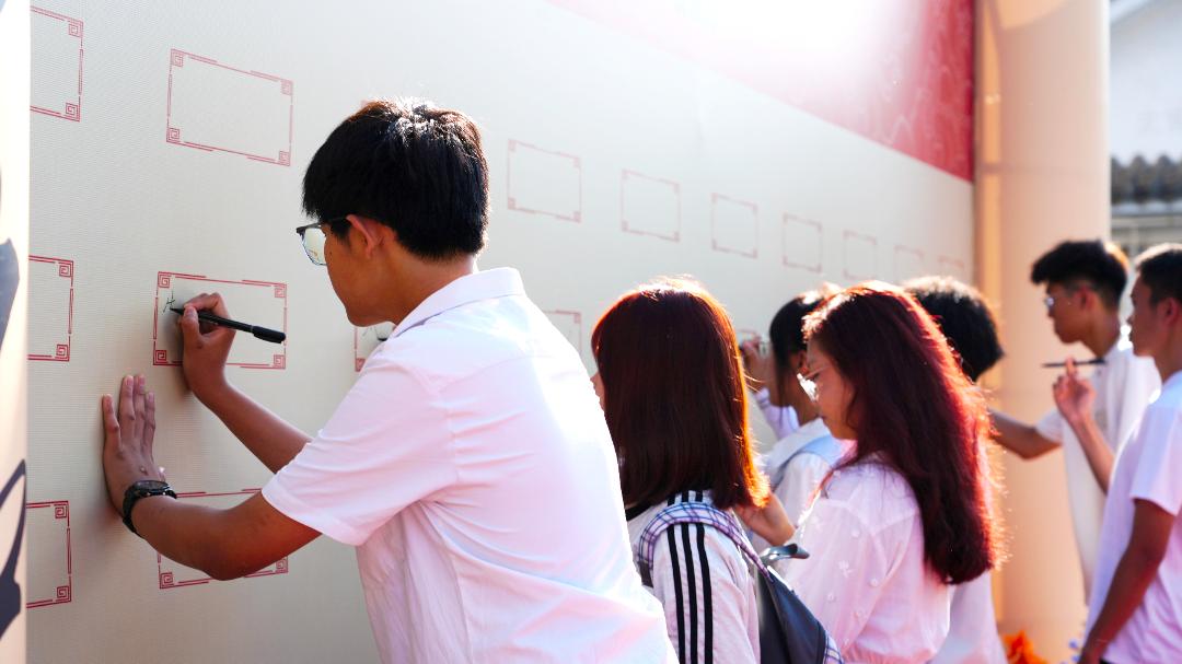 活动伊始,学子们纷纷在“金榜题名”签名墙上签名,而后昂首入场。