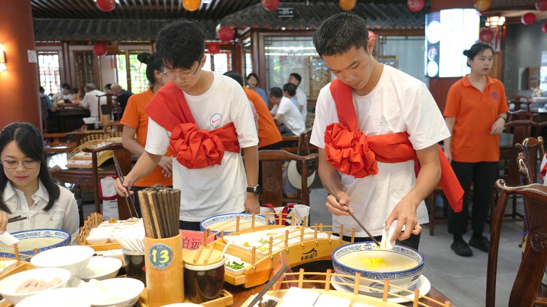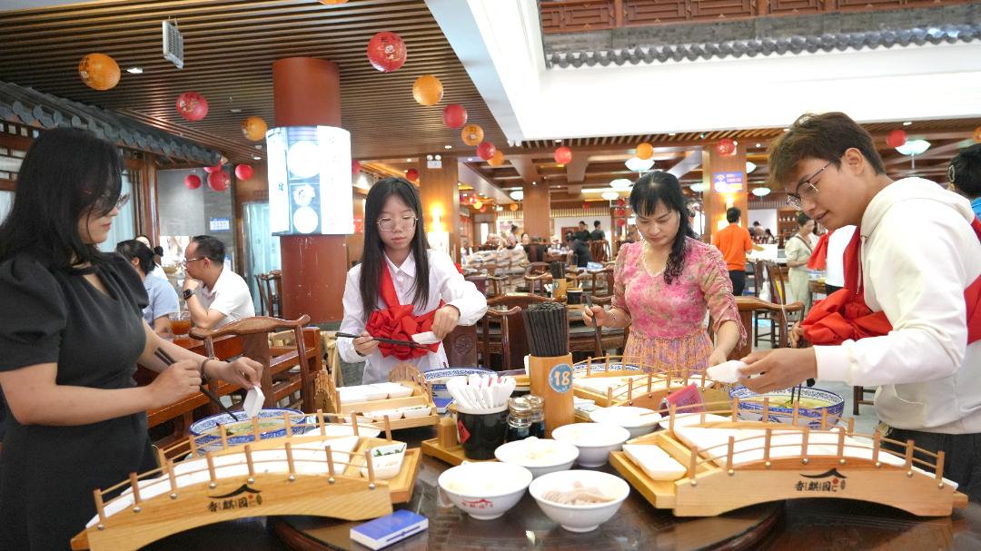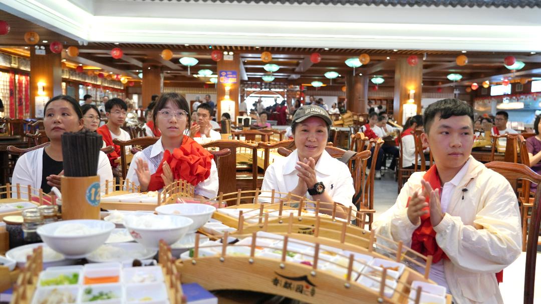 “甩米线咯!上汤!” 随着主持人一声吆喝,现场众人齐声呼应,一碗碗滚烫的过桥米线汤被端上桌。