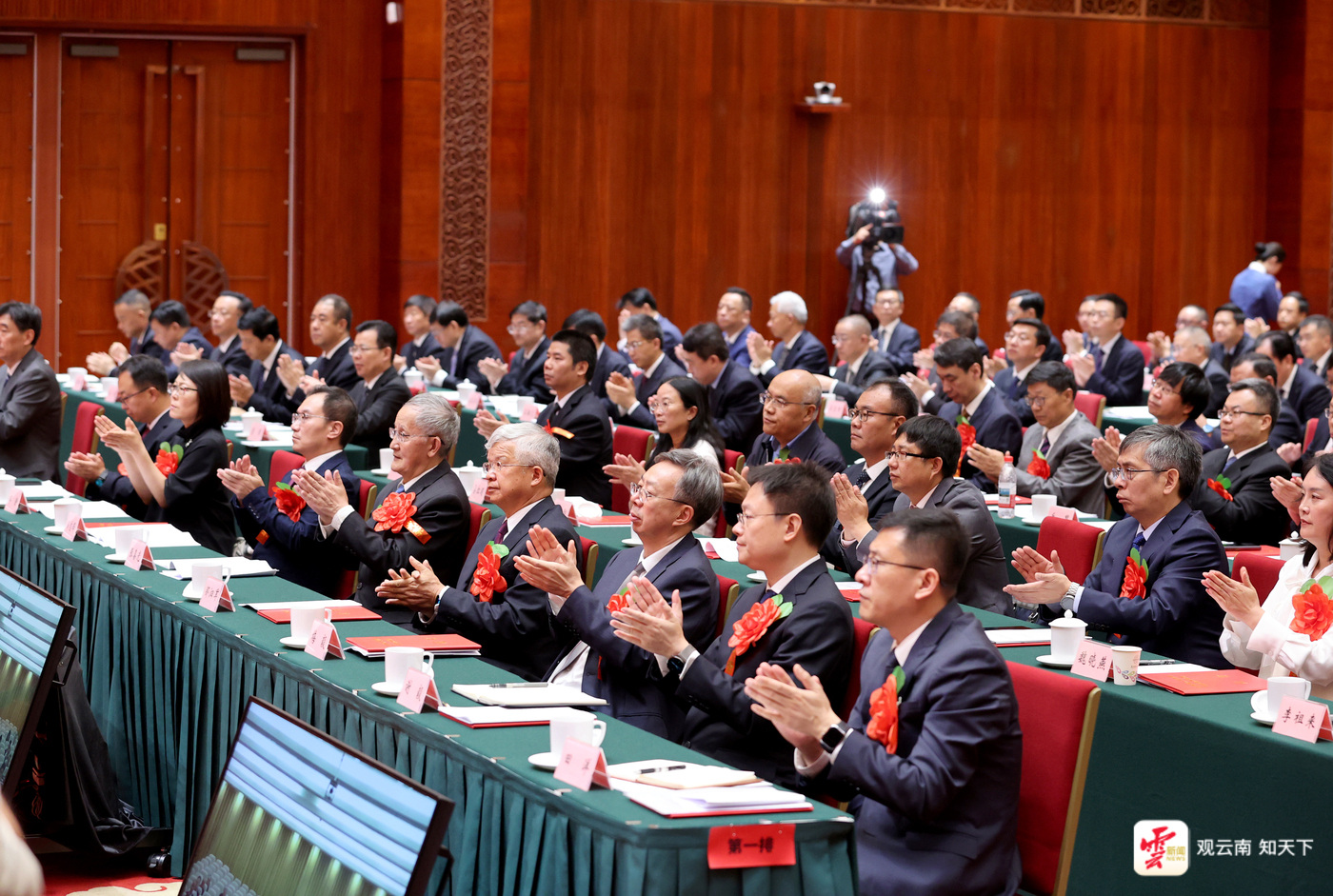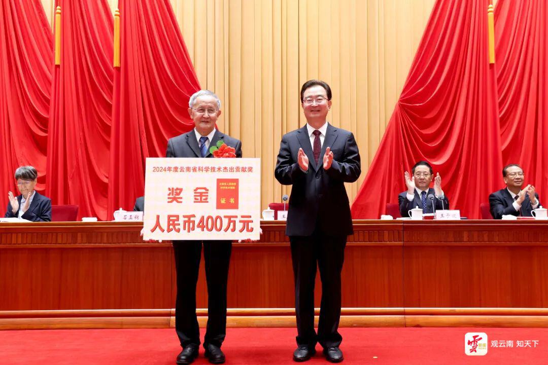 省委书记王宁为获得2024年度云南省科学技术杰出贡献奖的云南大学教授张喜光颁奖并讲话。省委副书记、省长王予波主持会议,省委副书记石玉钢、省政协主席刘晓凯出席。与会省领导为各奖项获奖代表颁奖。云南农业大学教授田洋代表获奖者发言。