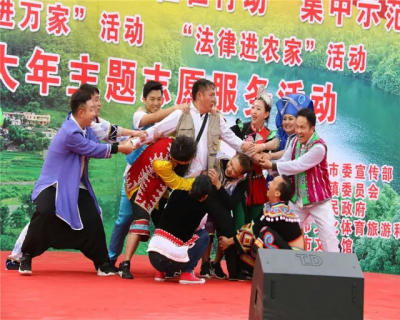在工作人员热情服务,答疑解惑的同时,我市2017年“三下乡”活动启动仪式的文艺表演也正火热进行。舞蹈《盛世华章》的优美舞姿刚一停下,小品《脱贫路上》接着演绎了一出农村脱贫攻坚的好戏,“脱贫路上不落下一家一户”的号召获得了台下观众的热烈掌声,情景快板《抢财神》则将村民为了学习枇杷、梨的种植技术而争抢退休种植专家的好戏搬上舞台,激发了现场村民脱贫致富的强烈愿望。最后,在彝族舞蹈《三步弦》的表演中,彝族姑娘邀请现场的干部和群众一起跳起欢快的舞蹈,在大家载歌载舞的节奏中,活动现场成为欢乐的海洋,热情洋溢彝族舞蹈将本次“三下乡”活动推向了高潮。