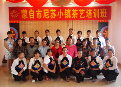 10月26日,我市尼苏小镇茶艺培训班举行结业典礼,来自尼苏小镇的35学员,经15天的茶艺培训,最终有19名学员通过理论和实际操作考核,达到中级茶艺师水平,出席结业典礼的副市长张礼毅,州职教社副主任李红等为19名学员颁发了结业证。
