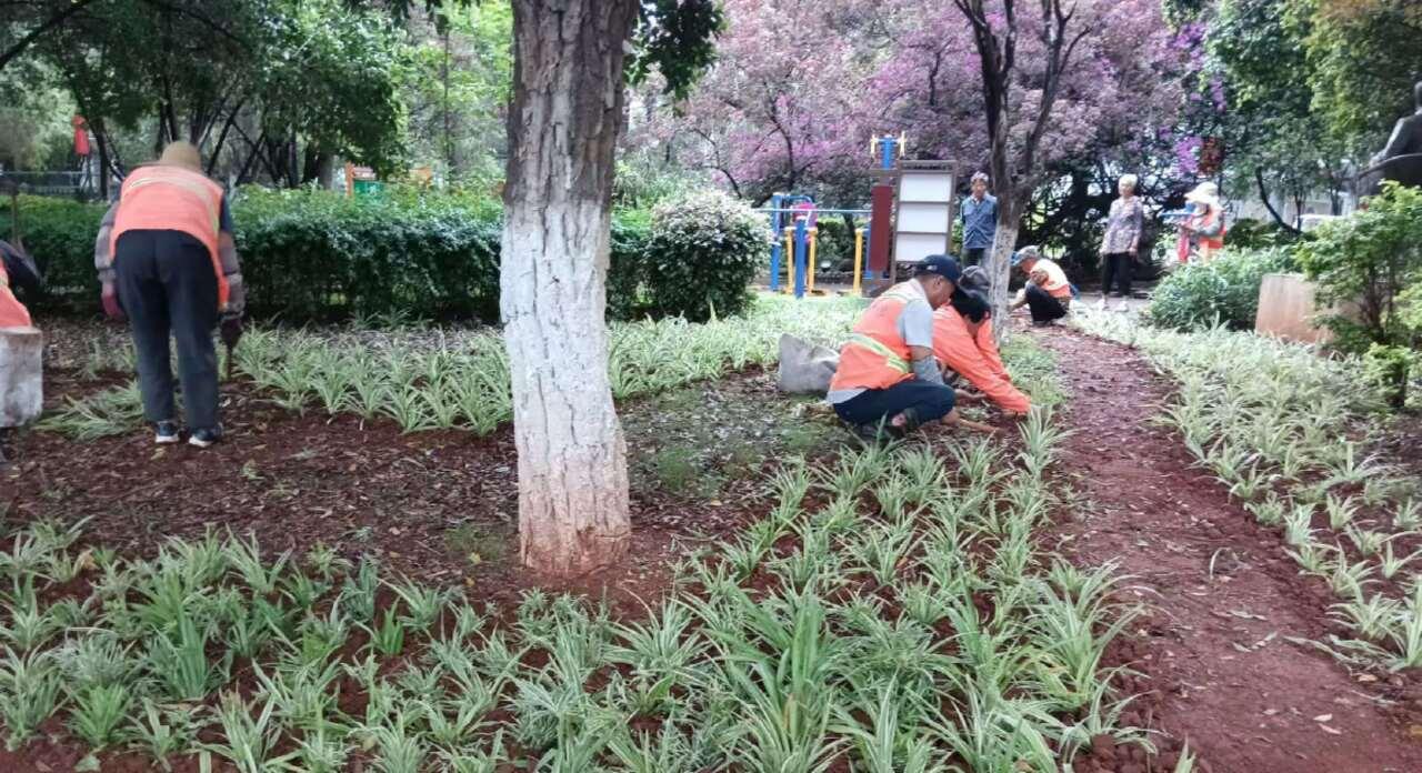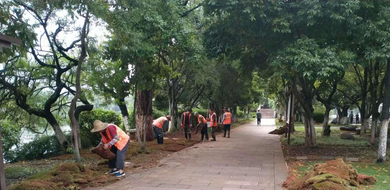 移栽补植花草苗木,打造靓丽景观。结合实际情况,全面摸排公园内老化、残株以及缺株断档等情况,确定补植苗木的位置、品类及数量,制定科学合理的补植方案,随整地、随栽植、随浇水,确保整体景观效果,切实解决绿化缺株断档、地被斑秃、黄土裸露等问题。进一步提升景观效果,打造植物、水体、山石、建筑融一体的园林景观,为市民游客提供了一个可休闲、可娱乐、可观赏的活动空间。截至目前,已补植栽植凤凰树、木槿等30株,草坪270平方米,麦冬、吊兰290平方米,紫娇花200平方米,摆放菊花650盆。