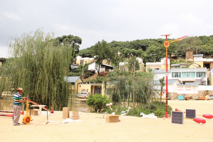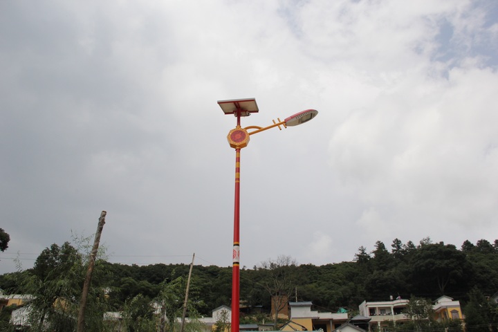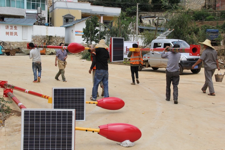 8月4日,齐星集团施工人员趁着天没下雨,抓紧安装调试西北勒乡新寨村的太阳能路灯。一盏盏绘有民族特色纹饰和图腾的太阳能路灯陆续矗立在房前屋后,搭配错落有致的新居,随风摇曳的杨柳,水波徐徐的碧塘,宛如岭南诗画。民族特色太阳能路灯的配备,不但能结束新寨村居民摸黑走路的日子,还能有效提升他们的民族自豪感。