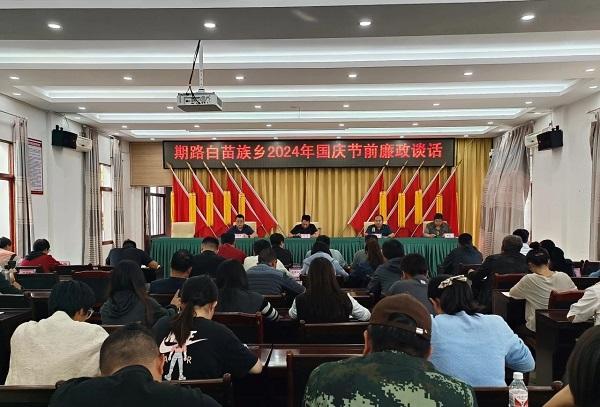 期路白苗族乡开展“国庆”节前廉政集体谈话,乡党委政府领导班子、全体干部职工、各村(社区)党总支书记、副书记、驻村队员共70余人参会。
