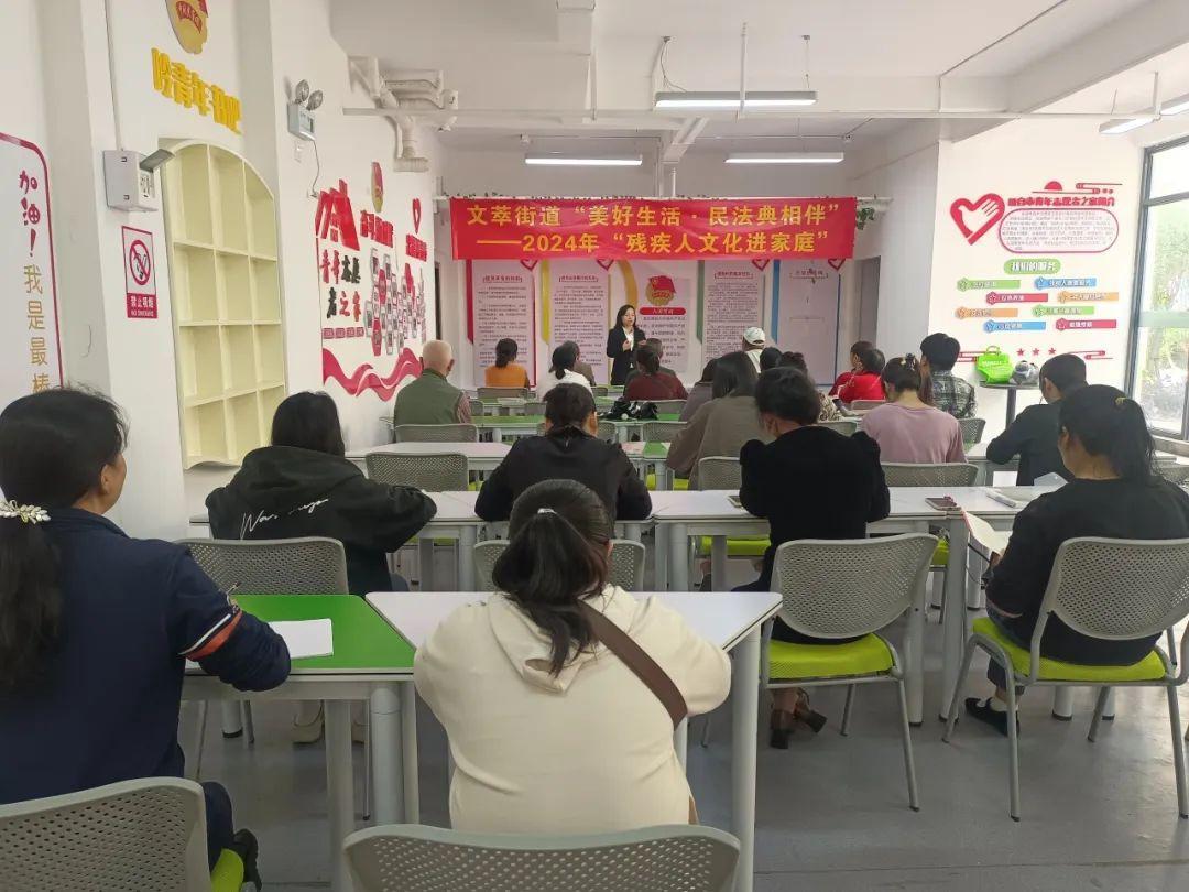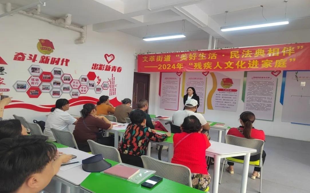 为深入推进《中华人民共和国民法典》知识的宣传普及,让《中华人民共和国民法典》走到残疾人身边、走进残疾人心里,形成办事依法、遇事找法、解决问题用法、化解矛盾靠法的好风尚、好氛围,2024年10月18日,文萃街道在明德社区开展“美好生活·民法典相伴”为主题的“残疾人文化进家庭”普法宣讲活动。活动共有32人参加,发放《中华人民共和国民法典大字版》书籍、读书笔记本和写字笔共28份。