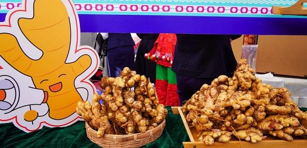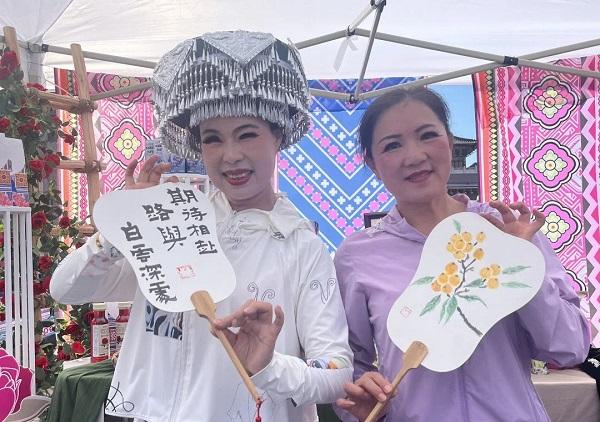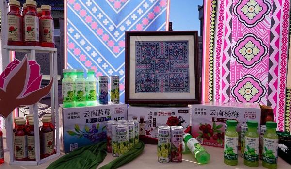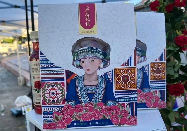 除了精彩的直播,期路白苗族乡的展示摊位也是别具一格。摊位上摆满了新鲜诱人的枇杷、娇艳芬芳的金边玫瑰、金黄饱满的小黄姜和清甜可口的 NFC 果汁饮料、具有独特魅力的民族服装,吸引了众多观众前来“打卡”。