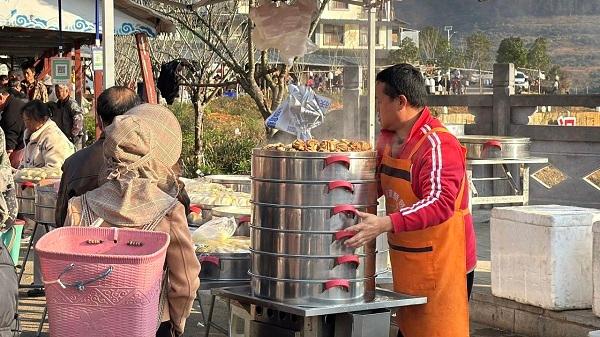 苗服摊位旁,夫妻俩一边缝制着各类服饰,一边向顾客介绍着各类产品;包子铺蒸汽氤氲,现烤的饵块,刚出炉的荞粑粑,总围满“先尝后买”的乡邻。方寸摊位虽小,却盛满生计与温情。