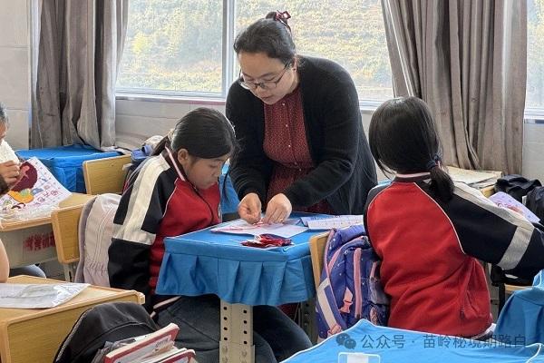 有文字的民族把自己的人文历史寄存于文字之间,没有文字的苗族就把自己的人文历史寄托于口传和民族服饰之上,把自己作为民族文化传承的载体。“苗绣”是苗族刺绣的简称,可分为平绣、辫绣、结绣、缠绣、绉绣、盘绣、挑绣等上百种。在期路白中心学校的课堂里,李挚老师正带着孩子们练习苗绣中入门的十字针法,让学生了解苗族的迁徙之路,了解苗族服饰文化以及苗族刺绣的历史、技艺和文化内涵,培养他们的动手能力和审美情趣,增强民族自豪感和文化认同感。
