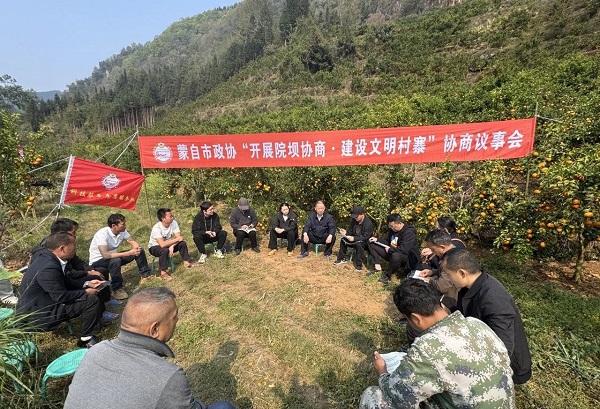 3月26日,蒙自市政协组织到期路白苗族乡岩子脚村开展“开展院坝协商•建设文明村寨”协商议事会,围绕岩子脚村沃柑产业发展中的难点问题与基层干部、村民代表面对面协商,共谋解决方案。会议由蒙自市政协文化文史和学习委员会主任李高翔主持,政协副主席普永忠、致公党蒙自市支部副主席赵滇、院坝协商工作组成员、期路白苗族乡领导干部、松树坡村委会、岩子脚村民小组干部及村民代表等25人参加会议。