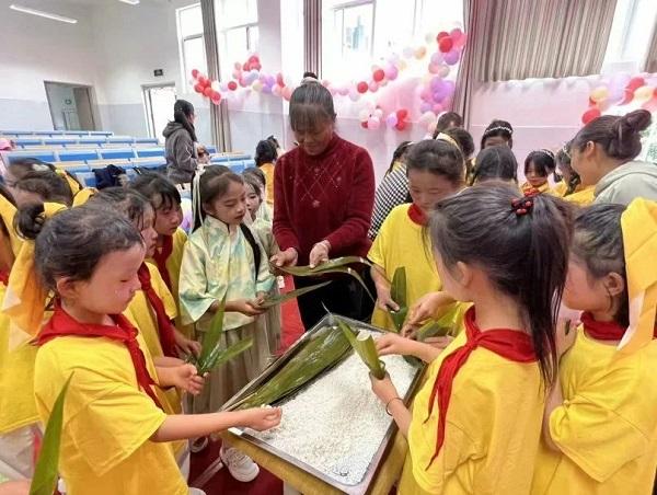 老师联合学生以及家长,共同在校园开展包粽子活动,将传统文化与家校情谊深度融合。在南部空军蓝天希望小学,老师与学生围坐一堂,手把手教授包粽子技艺,讲述端午故事。武警希望小学教室里,留守儿童通过视频连线与父母共包粽子,一针一线寄托思念。海军爱民学校则邀请家长志愿者指导学生制作创意非遗粽子,传承技艺的同时传递环保理念。粽香氤氲,涌动着“民族团结一家亲”的暖意。