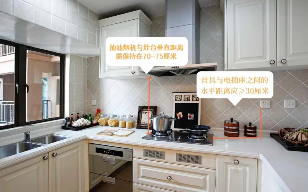 4、燃气灶具边缘与电插座水平间距须保持在30cm以上;抽油烟机与灶台垂直间距须保持在70-75cm。