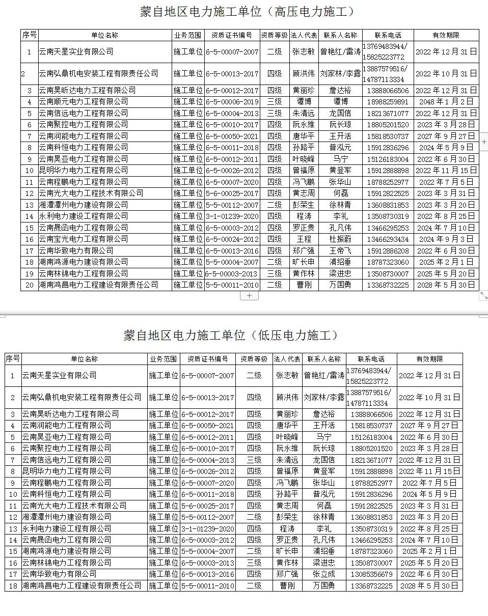 其他在蒙自地区的电力施工单位,如您单位未在表中公布,请与蒙自市能源局联系增加,联系电话0873-3812076。