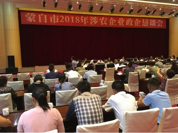 2018年5月29日下午14:30分,蒙自市人民政府在蒙自会堂召开蒙自市2018年涉农企业政企恳谈会。会议由市委常委、市委统战部部长周斌主持。会议围绕蒙自农林业发展现状及发展规划、农林项目招商推荐、政企间发展农林业好的经验、存在的问题和困难进行交流。